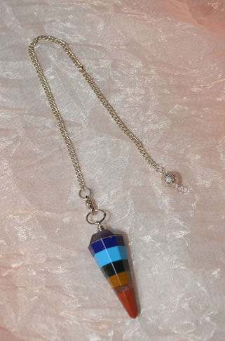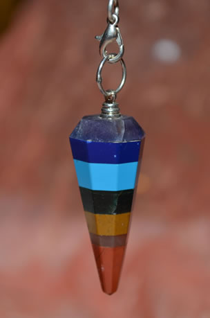 This beautiful high quality chakra pendulum is hand made and features 7 stone layers, each from a different semi-precious stone corresponding to the 7 main chakras of the body. The stones are, from top to bottom as follows: Amathyst, Lapis Lazuli, Turquose, Aventurine, Yellow Jasper, Carnelian,and Red Jasper.